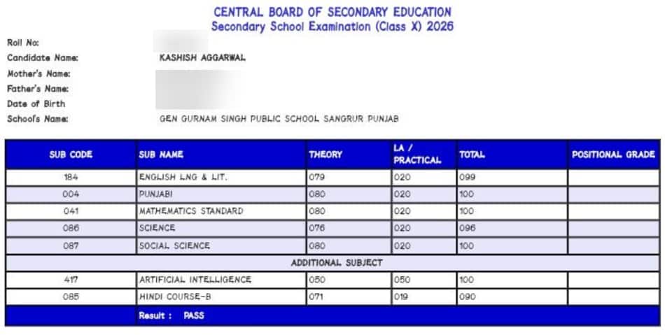 Kashish Aggarwal, a student of General Gurnam Singh Public School, Sangrur, Punjab, has scored 499 marks (99.8%) in the CBSE 10th result 2026. The results were declared on April 15, 2026, and Kashish has now secured her position among the CBSE Class 10 toppers 2026. She has scored a perfect 100 out of 100 in 4 subjects, including Punjabi, Mathematics (standard), social studies, and artificial intelligence. In the exclusive interview, she shared her academic journey and her preparation strategy.
