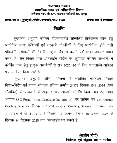 इससे पहले राजस्थान सरकार ने अनुप्रति कोचिंग योजना 2025-26 के लिए आवेदन तिथि की घोषणा की। योजना के लिए अभ्यर्थी 15 सितंबर तक आवेदन कर सकते हैं। आवेदन के लिए अभ्यर्थी एसएसओ पोर्टल SSO Portal sso.rajasthan.gov.in या SJMS SMS APP CM Anuprati Coaching Icon पर क्लिक करके भर सकते हैं।
