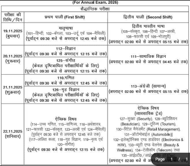 22 नवंबर, 2025 | वैकल्पिक विषय (उच्च गणित/वाणिज्य/अर्थशास्त्र/फारसी/सरकारी/अरबी/मैथिली) समय: सुबह 9:30 बजे से दोपहर 12:45 बजे तक (ललित कला/गृह विज्ञान/संगीत) समय: सुबह 9:30 बजे से दोपहर 12:15 बजे तक | वैकल्पिक विषय (वाणिज्यिक व्यापार/ सुरक्षा/ ब्यूटीशियन/ पर्यटन/ खुदरा प्रबंधन/ ऑटोमोबाइल/ इलेक्ट्रॉनिक्स/ वेलनेस/ दूरसंचार) समय: दोपहर 2:00 बजे से शाम 5:15 बजे तक |