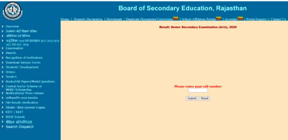 आरबीएसई 12वीं रिजल्ट 2026 (RBSE 12th result 2026 in hindi) विंडो निम्न छवि की तरह दिखेगी:
