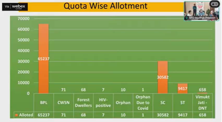 एमपी आरटीई सीट आवंटन में सर्वाधिक बीपीएल परिवार के 65237 बच्चों को सीटें आवंटित हुई हैं। इसके बाद एससी कटेगरी के 30582, एसटी कटेगरी के 9417, विमुक्त जाति के 658, सीडब्ल्यूएसएन के 71, वनवासी के 68, एचआईवी पॉजिटिव के 7 बच्चों के साथ 10 अनाथ बच्चे और कोविड में अनाथ एक बच्चे को सीट आवंटित की गई है।