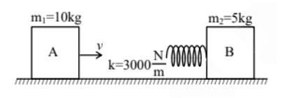 Consider two blocks A and B of masses $m_1=10$ kg and $\mathrm{m}_2=5 \mathrm{~kg}$ that are placed on a frictionless table. The block A moves with a constant speed $v=3 \mathrm{~m} / \mathrm{s}$ towards the block B kept at rest. A spring with spring constant $\mathrm{k}=3000 \mathrm{~N} / \mathrm{m}$ is attached to the block B as shown in the figure. After the collision, suppose that the blocks A and B, along with the spring in a constant compression state, move together, then the compression in the spring is (Neglect the mass of the spring)