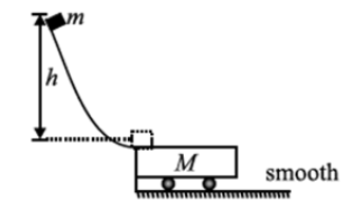 A carriage of mass $M$ and length $\ell$ is joined to the end of a slope as shown in the figure. A block of mass $m$ is released from the slope at height $h$. It slides till the end of the carriage. The friction between the mass and the slope, and also the friction between the carriage and the horizontal floor, is negligible. Coefficient of friction between block and carriage is $\mu$. Find $h$ in terms of the given parameters.