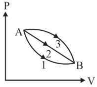 Question 4: A given mass of gas expands from the state $A$ to the state $B$ by three path 1,2 and 3 as shown in the figure. If $W_1, W_2$ and $W_3$ as respectively be the magnitudes work done by the gas along three paths then: