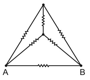 & \frac{1}{\mathrm{R}_{\mathrm{AB}}}=\frac{1}{2 \mathrm{r}}+\frac{1}{2 \mathrm{r}}+\frac{1}{\mathrm{r}}=\frac{2}{\mathrm{r}} \\
