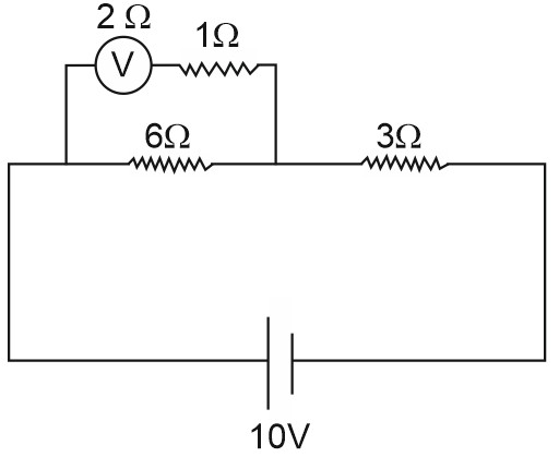 $\begin{aligned} & 4 V=I(2)+I(1) \\ & I=\frac{4}{3} \\ & \text { Reading of voltmeter }=I \times 2=\frac{8}{3}\end{aligned}$