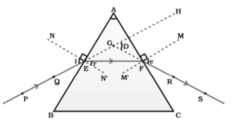 Q6: Explain the refraction of light through a triangular glass prism using a labelled ray diagram. Hence, define the angle of deviation.