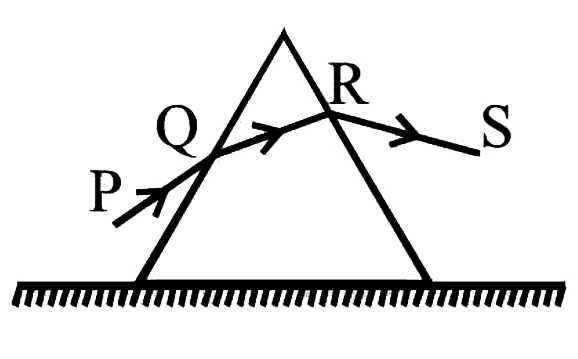 Q2: One ray of light suffers minimum deviation in an equilateral prism P, additional prisms Q and R of identical shape and made up of the same material, as shown in the figure. The ray will now suffer ________