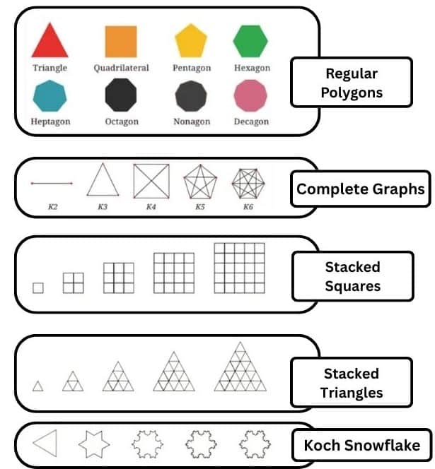 Patterns in Shapes: Patterns in shapes are certain arrangements of shapes like triangles, rectangles, pentagons, squares, etc.