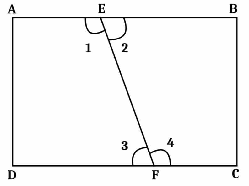 The angles formed with a line along the fold created are ∠AEF, ∠BEF,∠DFE, and ∠CFE, which are marked with 1, 2, 3, and 4. Out of these angles ∠AEF and ∠CFE are the larger ones, whereas ∠BEF and ∠DFE are the smaller ones.