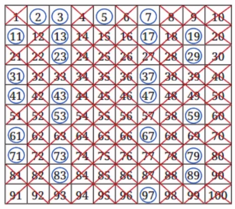 We hence observe that all the circled numbers are prime numbers and all the crossed-out numbers, other than 1, are composite numbers. This is the Sieve of Eratosthenes.