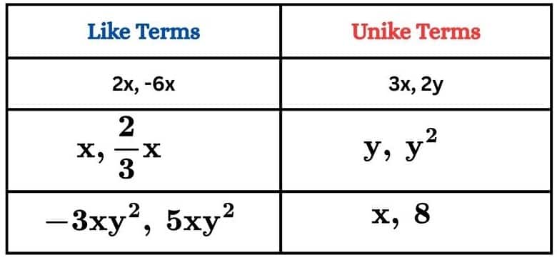 Unlike terms are the exact opposite. They have different variables and different powers. They can't be combined.