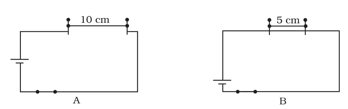 Q1: Paheli took a wire of length 10 cm. Boojho took a wire of 5 cm of the same material and thickness. Both of them connected the wires as shown in the circuit given in the Figure. The current flowing in both circuits is the same.